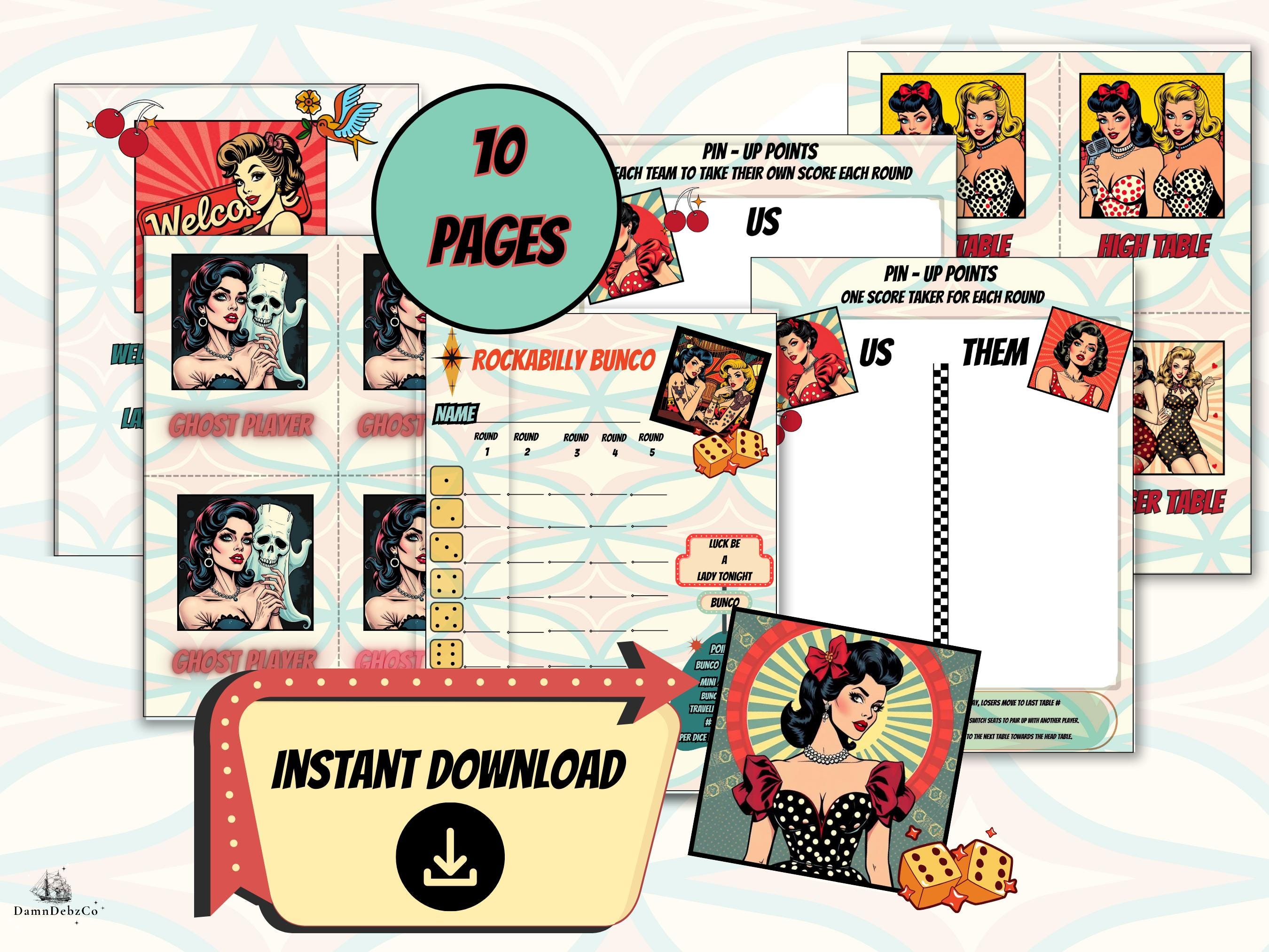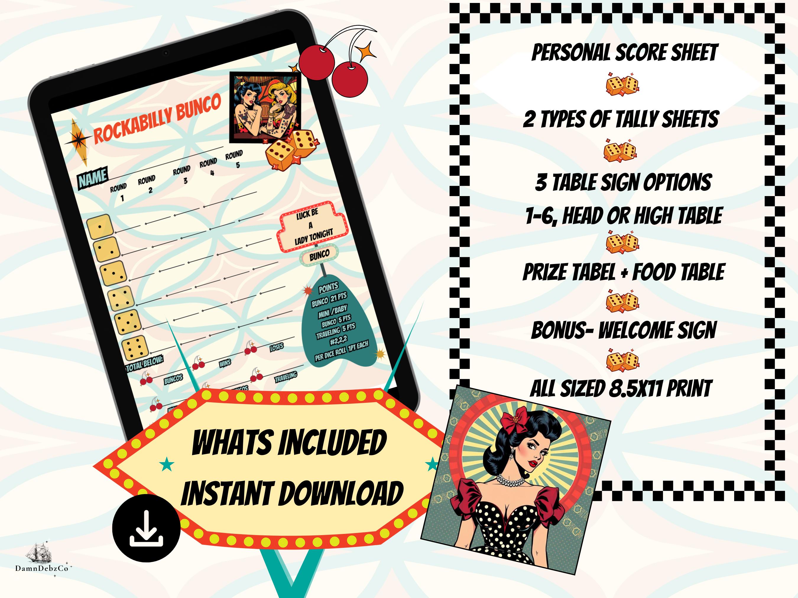 Rockabilly Bunco Party Printable – Retro 50s Pin-Up Bunco Score Sheets + Table Signs | Instant Download